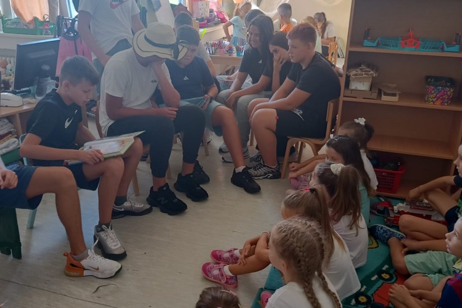 Дана 5.9.2025. једна од двочасовних сарадничких активности осмака и предшколаца била је читање бајки. Ученици осмог разреда пажљиво су читали бајке предшколцима и мотивисали их да размисле о прочитаном, анализирају текст и искажу своје мишљење.У посети предшколцима и њиховој васпитачици… Прочитај више »Осмаци читају бајке предшколцима
