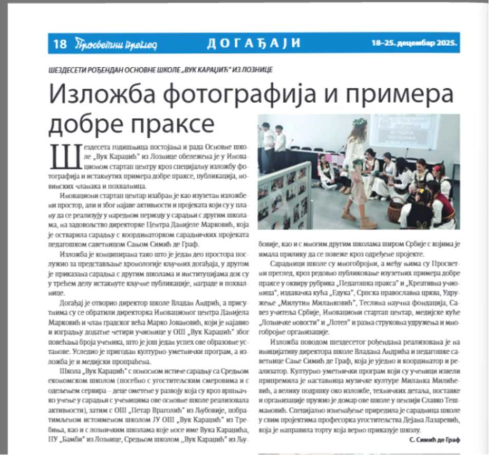 Обележавање јубилеја 60 година постојања и рада наше школе публиковано у Просветном прегледу број 3041/2 од 18-25.децембра 2025.