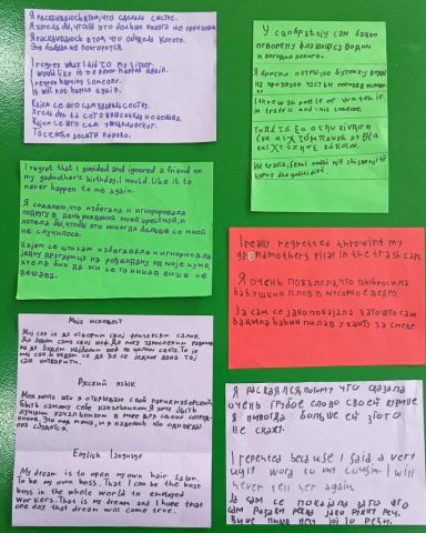 – ЕМПАТИЈА И ОДГОВОРНОСТ ,,Моја мала исповест“- ученици су имали задатак да анонимно напишу другу/другарици према коме се нису понели коректно писмо где изражавају жаљење за свој поступак и спремност да побољшају своје понашање тражећи опроштај од особе према којој се нису понели коректно. Исповест су писали на српском, енглеском и руском језику као и на језицима које познају. Добили су задатак да промисле о свом поступку и како избећи овакве ситуације. Да ли би исто то сад учинили? Да ли је боље размислити, сачекати пре него одреаговати повредити некога? Да ли нам помаже да ставимо себе у позицију друге особе?
