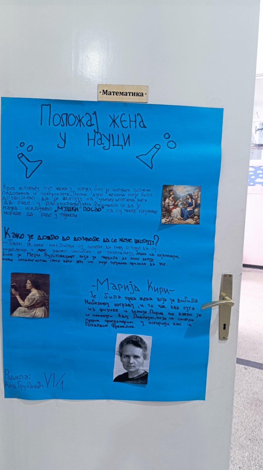 Ученице VII разреда, заједно са наставницом математике Снежаном Пантић, обележиле су Међународни дан жена и девојчица у науци, који се широм света обележава 11. фебруара. Овај дан посвећен је истицању значаја улоге жена у науци, као и подстицању девојчица да се заинтересују за научна истраживања и образовање.