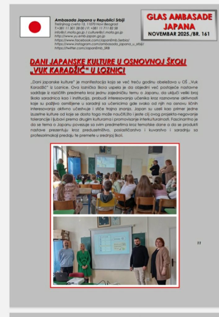 Велику част нам је указала Амбасада Јапана. Наше активности кроз пројекат ,,Дани јапанске културе“, које се обележавају већ трећу годину заредом, објављене у Гласу Амбасаде Јапана.