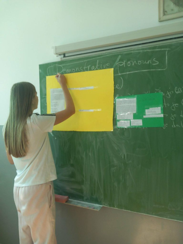 У сусрет Европском дану језика, дана 12.9.2025. ученици 8-1 разреда имали су интегративан двочас биологије и енглеског језика. Наставнице биологије Марија Поповић и енглеског језика Сања Симић де Граф интегрисале су наставне јединице својих предмета предвиђене оперативним планом рада и то ,,Ћелије и матичне ћелије“ и Starter unit – Language focus (Comparing the past and present). Након што је наставница биологије са ученицима обновила из претходних година о ћелији, ученици су кроз групни рад на основу текста о ћелији и матичним ћелијама који је приредила наставница енглеског језика у сарадњи са наставницом биологије, имали задатке различите тежине уважавајући специфичне способности ученика, индивидуализацију и ИОП. Групе су имале задатке разумевања прочитаног текста, идентификовања глаголских времена у реченици, пребацивања садашњег у прошло време и обрнуто,дискусију на тему матичних ћелија као и већ добро познату вежбицу ,,Покажи шта знаш“ која подстче креативност и специфичне карактеристике сваког ученика. Дете које ради по ИОП2 имало је специфичне задатке на исти текст уз подршку вршњачких едукатора и прилагођеним вежбицама једноставнијих граматичких форми и вокабулара.